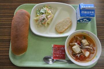 <給食一口メモ>みなさん、もうすぐ夏休みですね。すでに楽しみな予定が入っている人もいるかもしれませんし、夏休みに頑張りたいことがある人もいるかもしれません。夏休みに気をつけてほしいのは、食生活です。夏バテや夜ふかしが原因で食事を抜いてしまうことのないようにしましょう。今日のような具だくさんのスープをとることで、冷えやすい身体を温めることができます。
